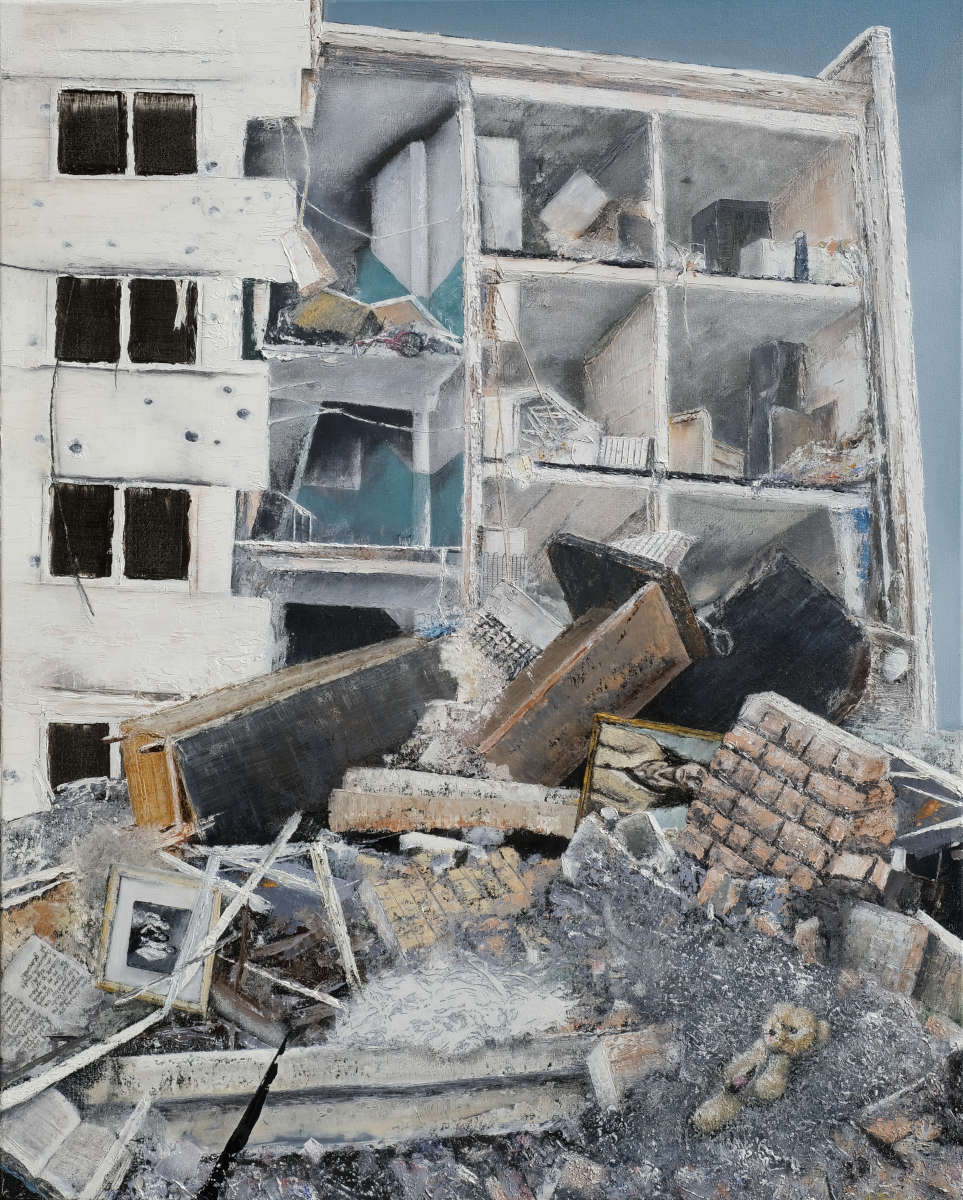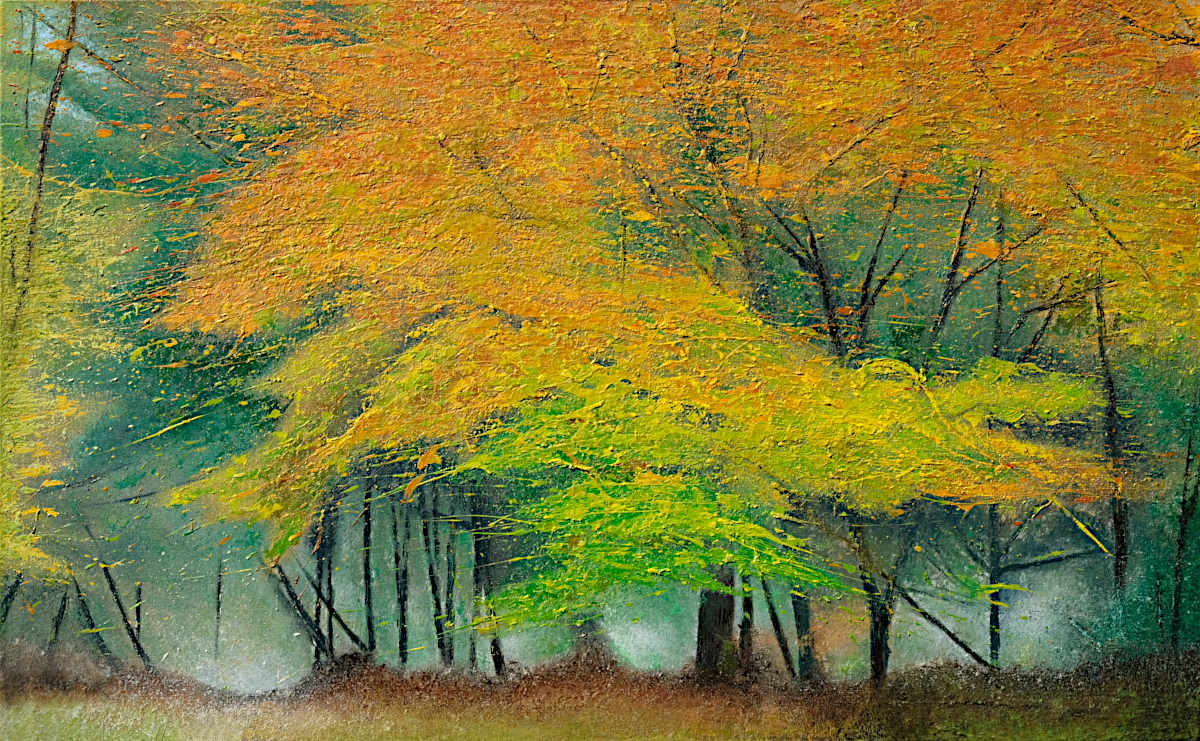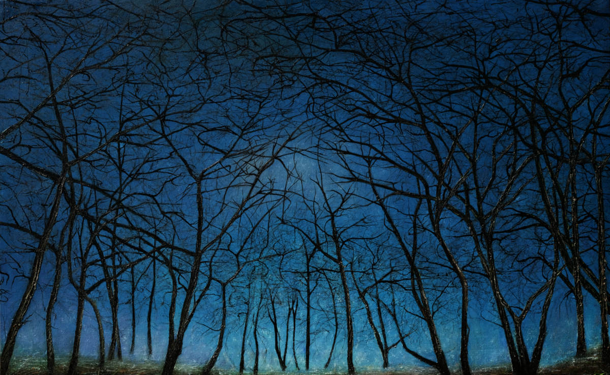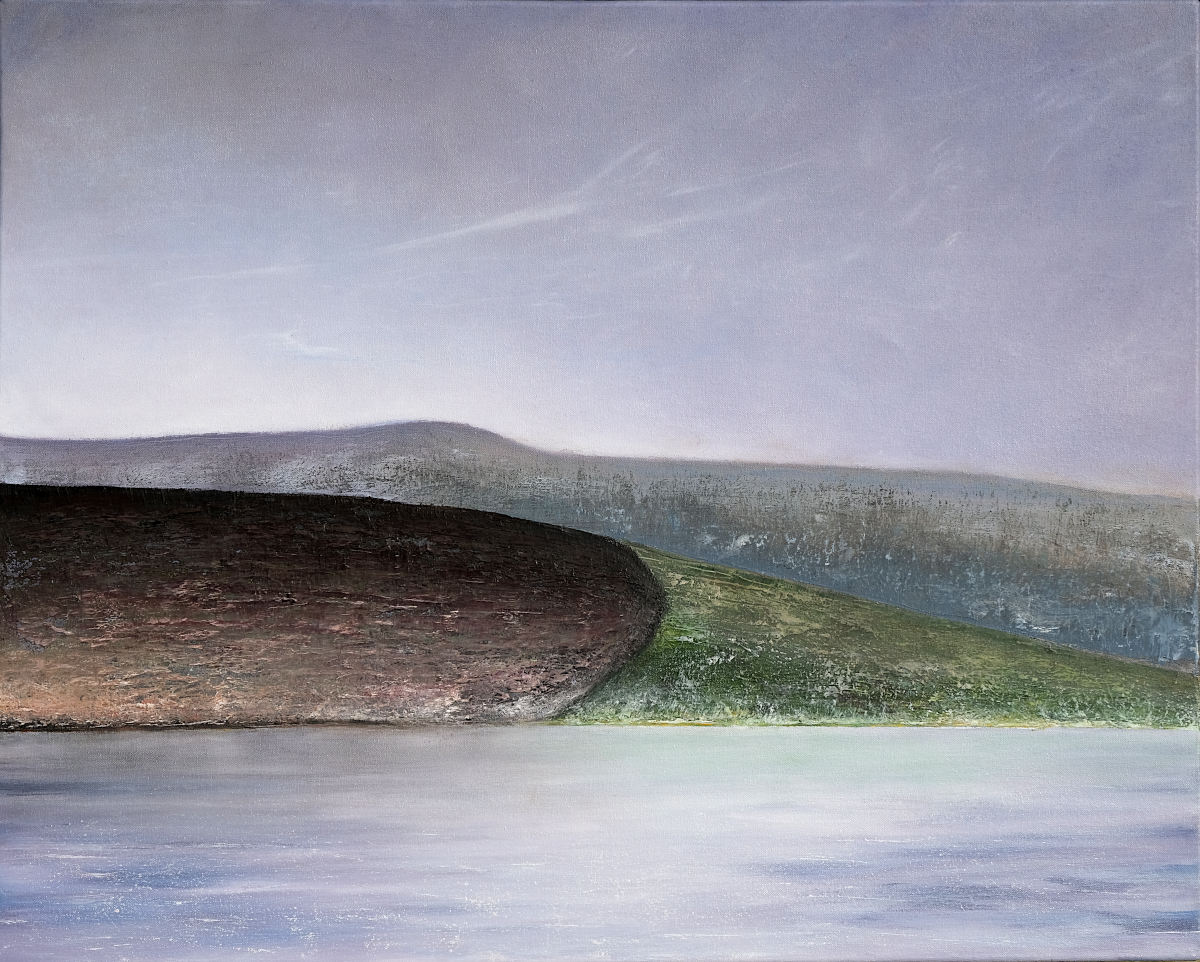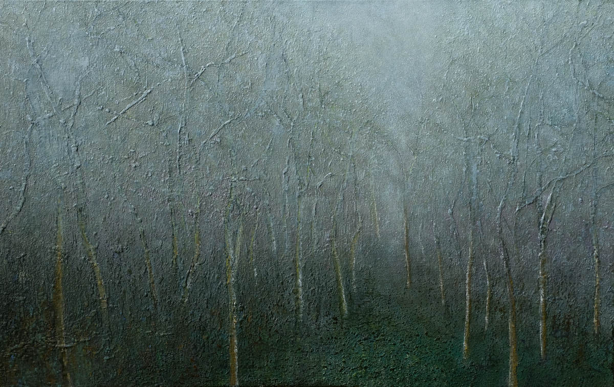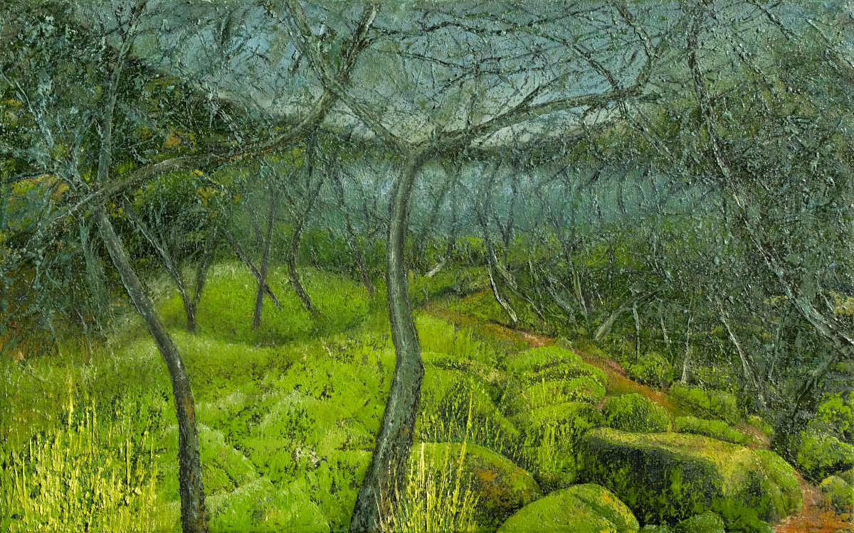 Paintings inspired by landscape, all oil paint on canvas, including forests, seascapes and war zones, among other subjects.