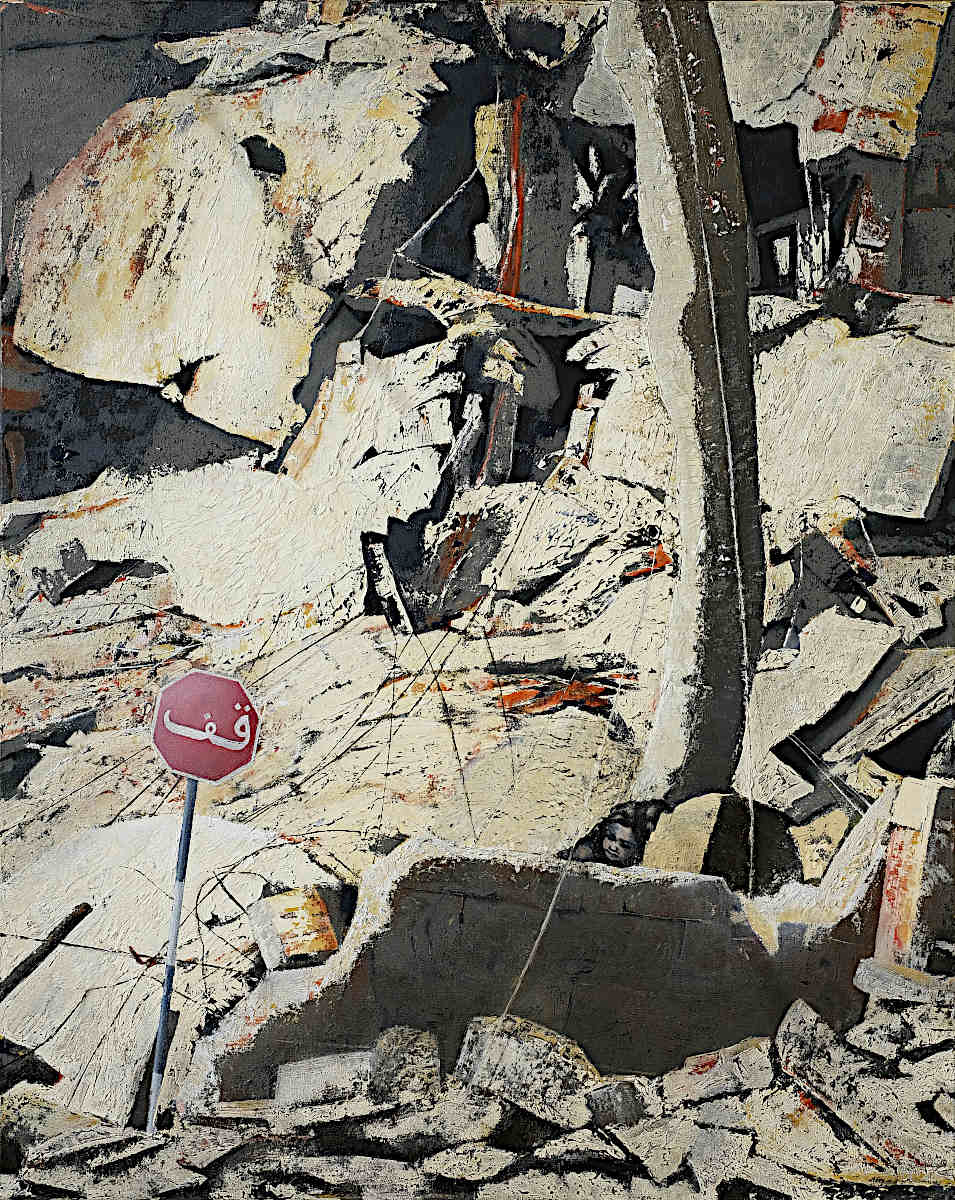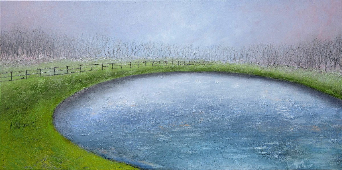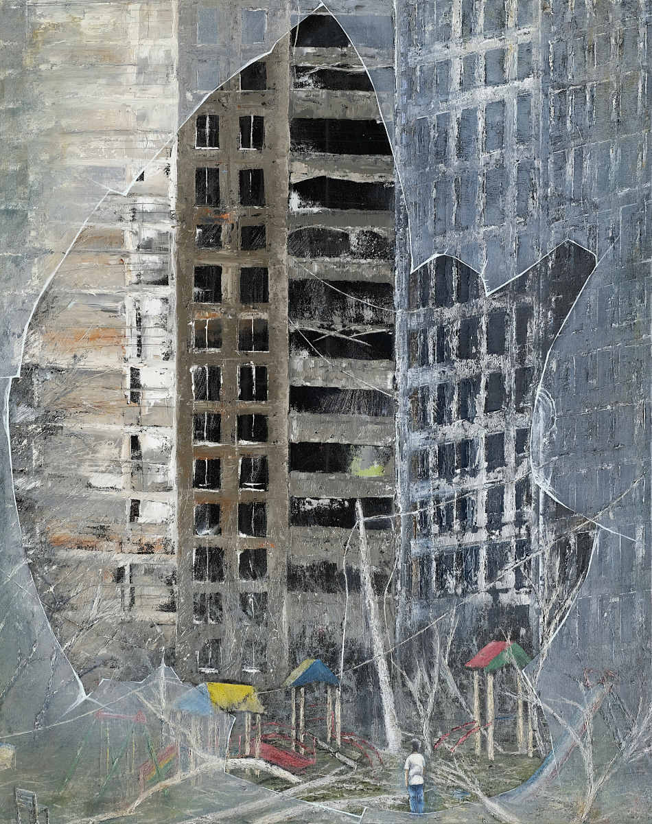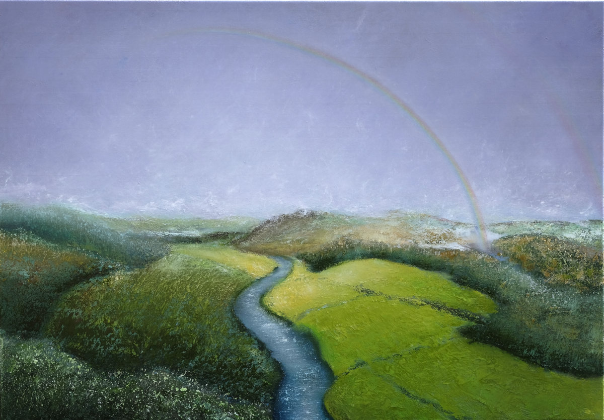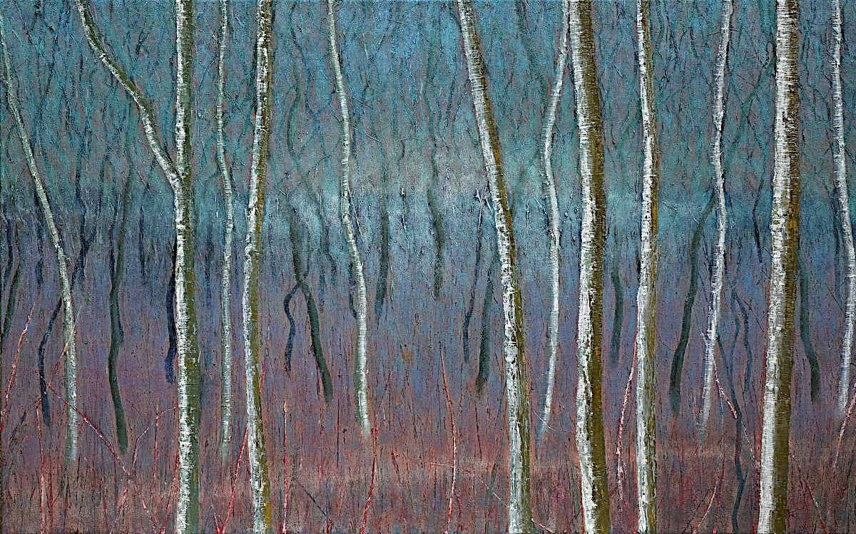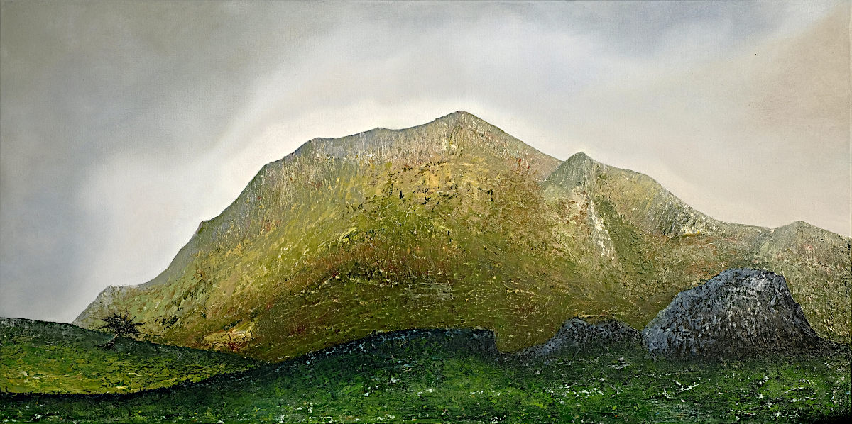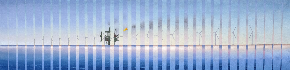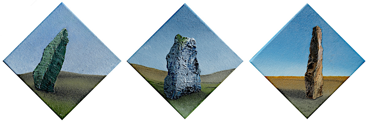 Paintings inspired by landscape, all oil paint on canvas, including forests, seascapes and war zones, among other subjects.