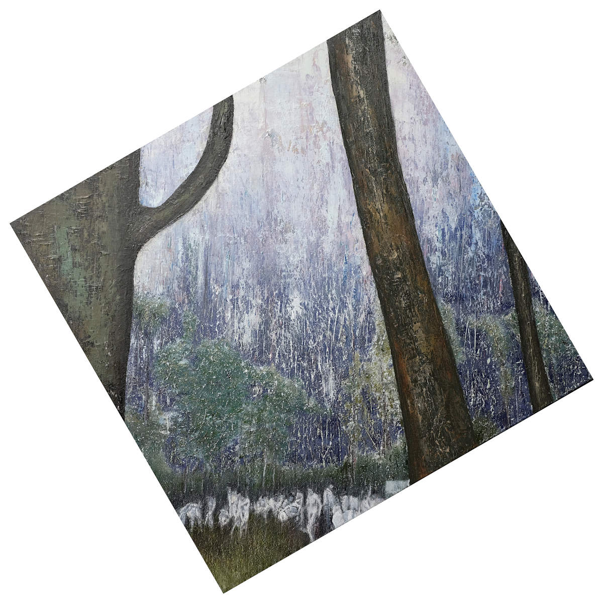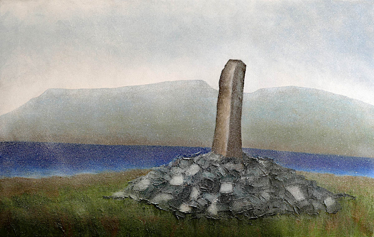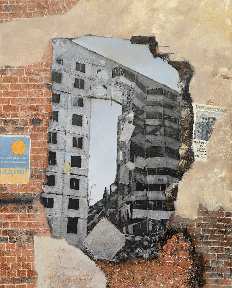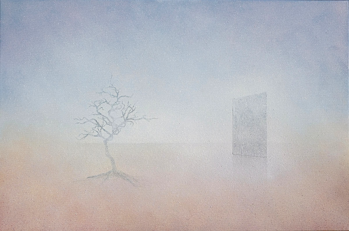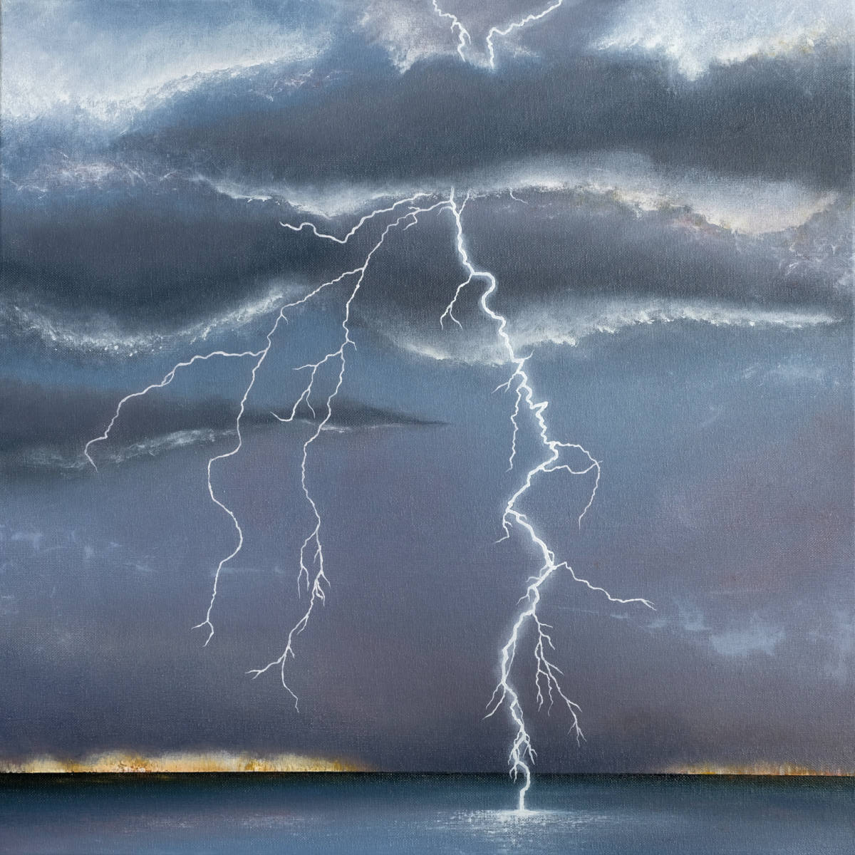 Paintings inspired by landscape, all oil paint on canvas, including forests, seascapes and war zones, among other subjects.